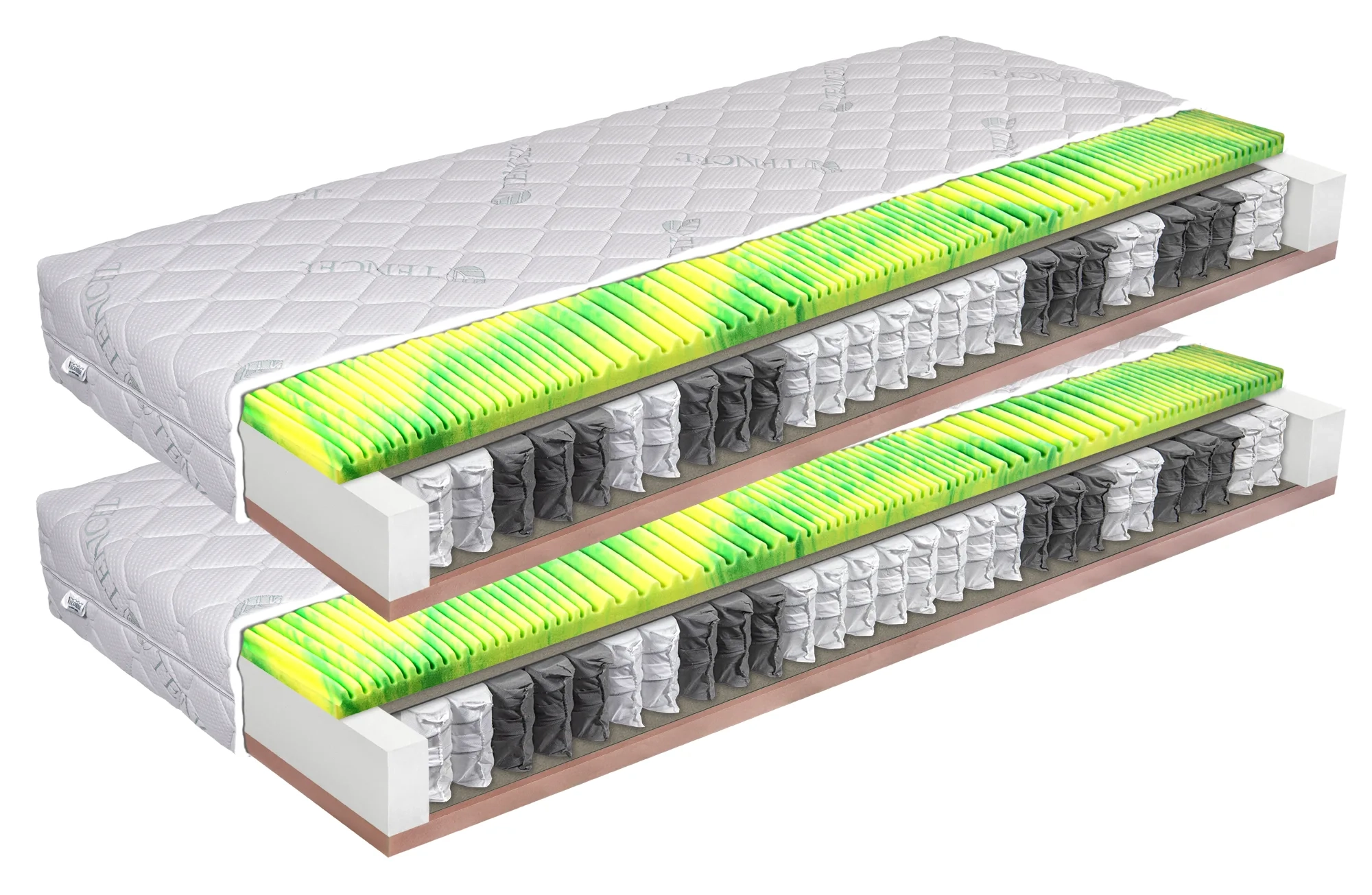 Viscosense, taštičkové pružiny, HR a PUR pěna, filc, tuhost 3/4 (rozsah 1-5), nosnost 130 kg, výška 22 cm, 7 zón