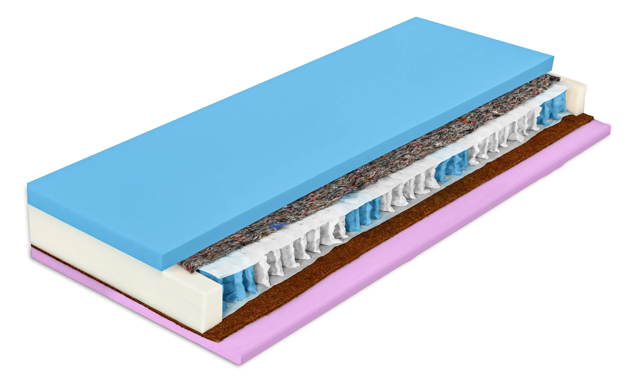 Kombinace taštičkového jádra a kokosové vrstvy zajišťuje nepřetržité proudění vzduchu, čímž omezuje přehřívání a pocení.