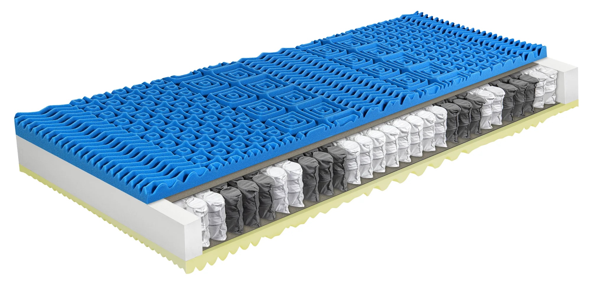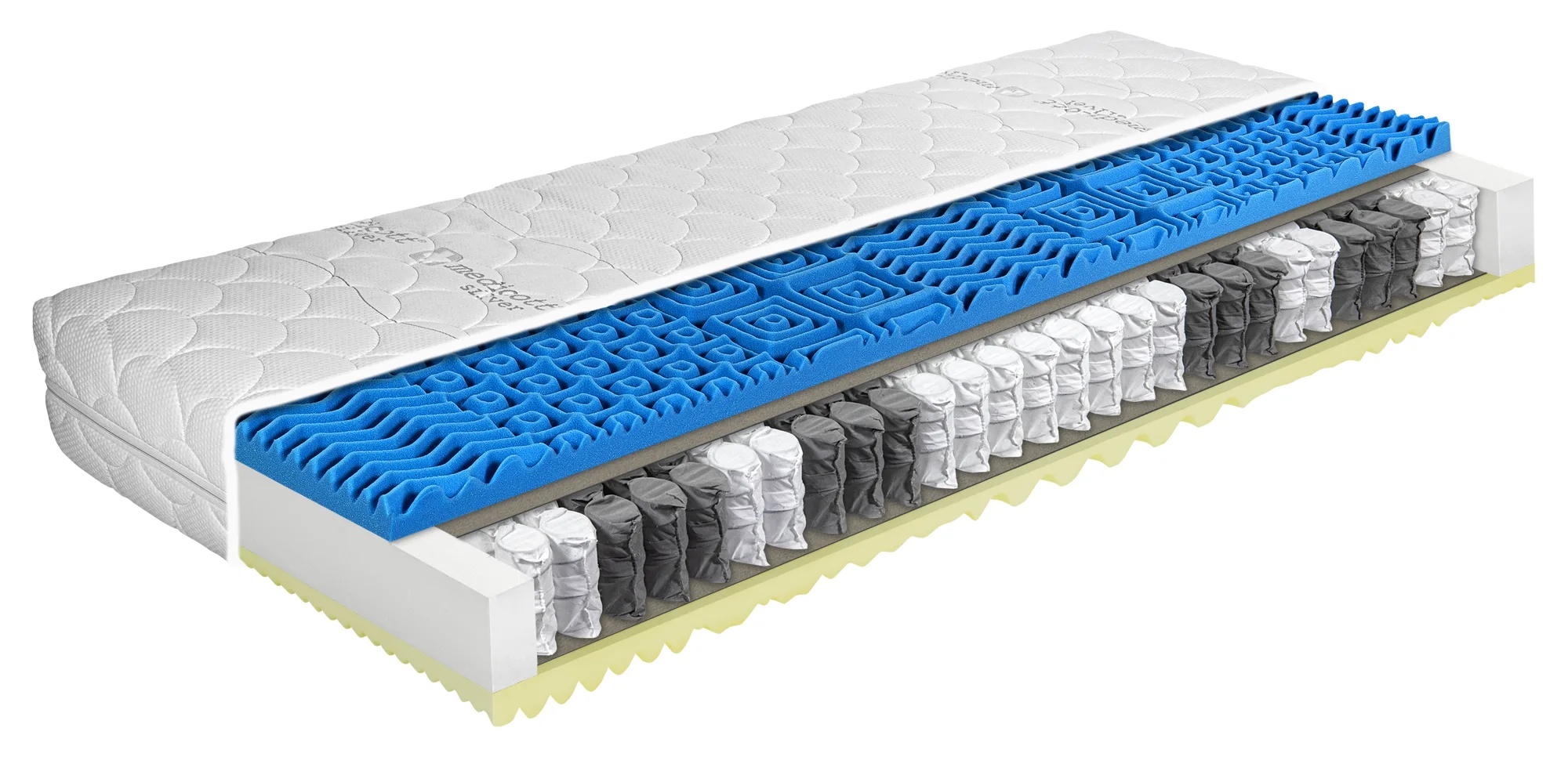 Její jádro tvoří stovky taštičkových pružin, které chrání vrstva filcu a obklopuje prodyšná 7zónová PUR pěna.